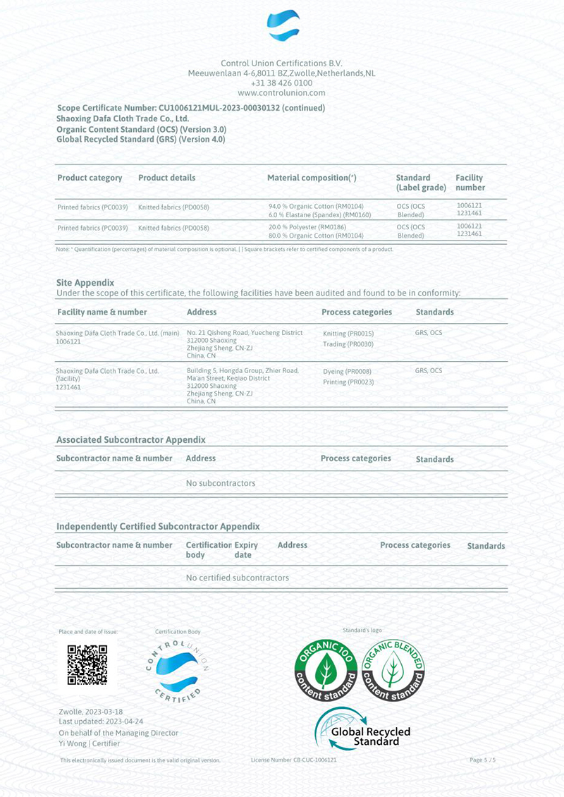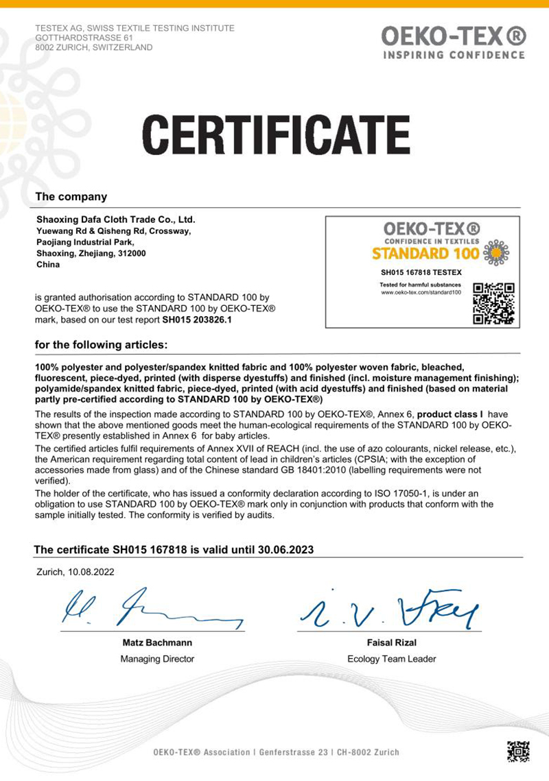 DAFA成立于2003年,現已發展為一家集研發、生產與國際貿易于一體的高端紡織綜合企業,始終專注于創新驅動、卓越品質與可持續發展。公司配備完善的CNAS標準自有研發中心,并布局針織、染整、印花等全流程制造工廠,協同全球貿易體系,為國際一線品牌提供高性能、定制化的面料解決方案。所有運營環節均嚴格遵循國際規范,先后通過OEKO-TEX?GRSGOTSDisney FAMAHigg FEM等多項全球權威認證。